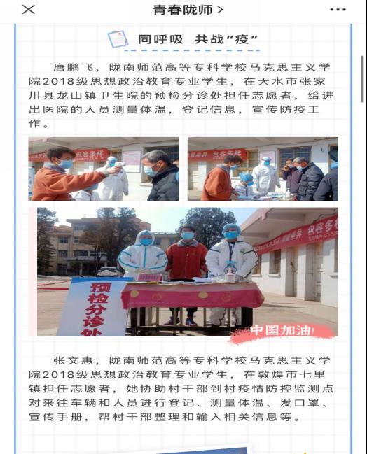 新型冠状病毒肺炎疫情之下,有危险逆行奋斗在最前线的医务、防疫工作者,也有在新春佳节期间仍坚守在岗位的普通人,陇师的学子们也主动请缨参与家乡疫情防控工作,积极参与到疫情防控志愿者的工作之中。
