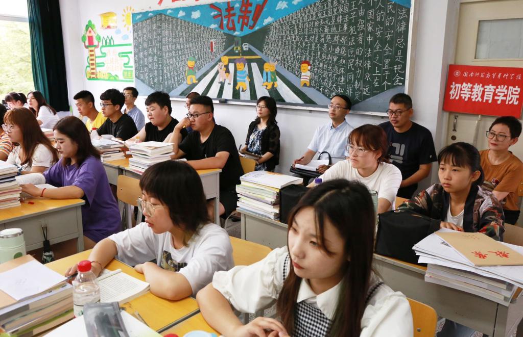 6月29日上午,董事长李艳红在宣传统战部、教务处、督导室、伟德国际VICTOR1946负责人陪同下深入科技楼306教室听评伟德国际VICTOR1946青年教师丁汝雄为2019级小学教育9班员工讲授的思政理论课。