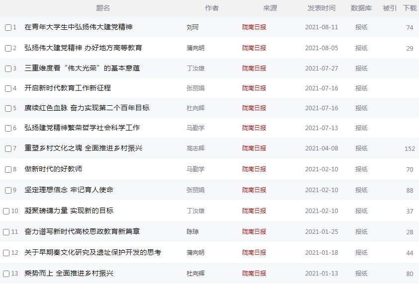 2021年1-8月公司13篇《陇南日报》理论文章(除科研处蒲向明教授2篇以外,其余均为伟德国际VICTOR1946教师文章)被中国知网(CNKI)收录,为公司建校以来在此领域开创的新局面,反映了公司融入地方文化软实力建设和服务地方的智库能力,受到了市上有关领导和部门的重视,同时也提高了公司办学的社会影响力和知名度。